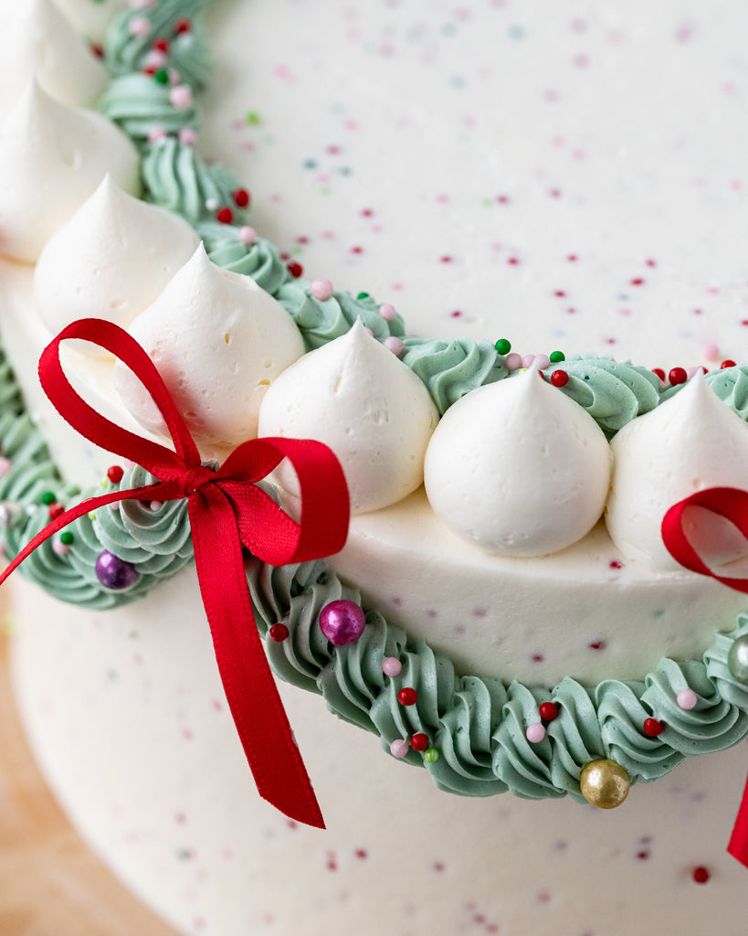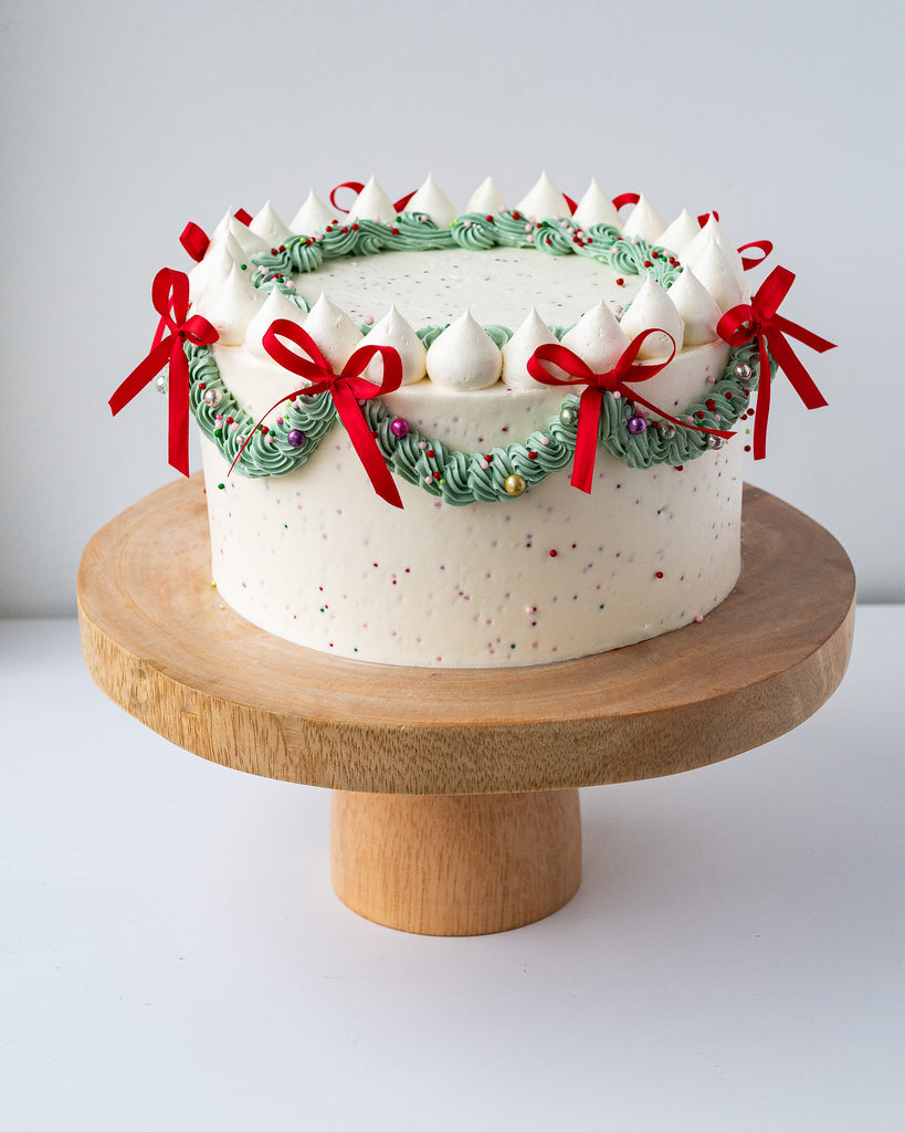 4. Egg nog cheesecake - cinnamon + nutmeg spiced cake with an egg nog cheesecake and graham crumb centre, plus two layers of egg nog buttercream. covered in holiday sprinkle vanilla buttercream and decorative garland